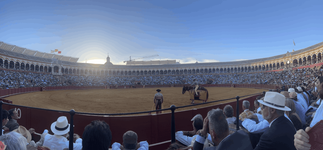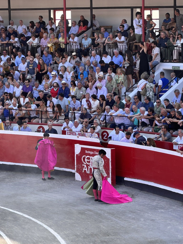 La tarde en Sevilla el 26 de abril es extremada e inusualmente calurosa. Juan Ortega espera junto al burladero la salida de su primer toro. Mira hacia abajo con el capote enhiesto como un parapeto pero el torero se oculta, se toca la cara en un gesto de nerviosismo. Baja el mentón con timidez. ¿Quién puede saber lo que vendrá ahora? Es fuego la tarde pero blanco tirando a rosa palo el vestido. Apenas quedan segundos para que salga el toro pero la tauromaquia es la única de las artes que no tiene posibilidad de ensayo hasta que salga el toro. Habrá entrenamientos, toreo de salón, tentaderos. Pero la verdad se realiza en un minuto con un animal incierto delante. Y si este quiere. Y si el torero puede. Acoplarse por ello es tan difícil. Recibe al toro Juan Ortega: hay un primer enganchón en el primer lance. ¿Podrá esta vez? Sí, ha sido falsa alarma. Y desde aquí se suceden cinco lances, cadenciosos, más lentos que este texto, que se cierran con una media. Juan Ortega ha podido. Hay música. Hay palmas. Hay que sacar al toro. Por delantales. Fijémonos en las manos. Fijémonos en la figura. Hay uno o dos para el recuerdo. Tras el segundo pullazo, entra Morante arrebatado por chicuelinas y responde Ortega. Debe hacerlo. De nuevo las verónicas. Y una chicuelina que viene de lejos desde Triana. Enroscado, cubriendo la delgada desnudez del traje blanquirosáceo.