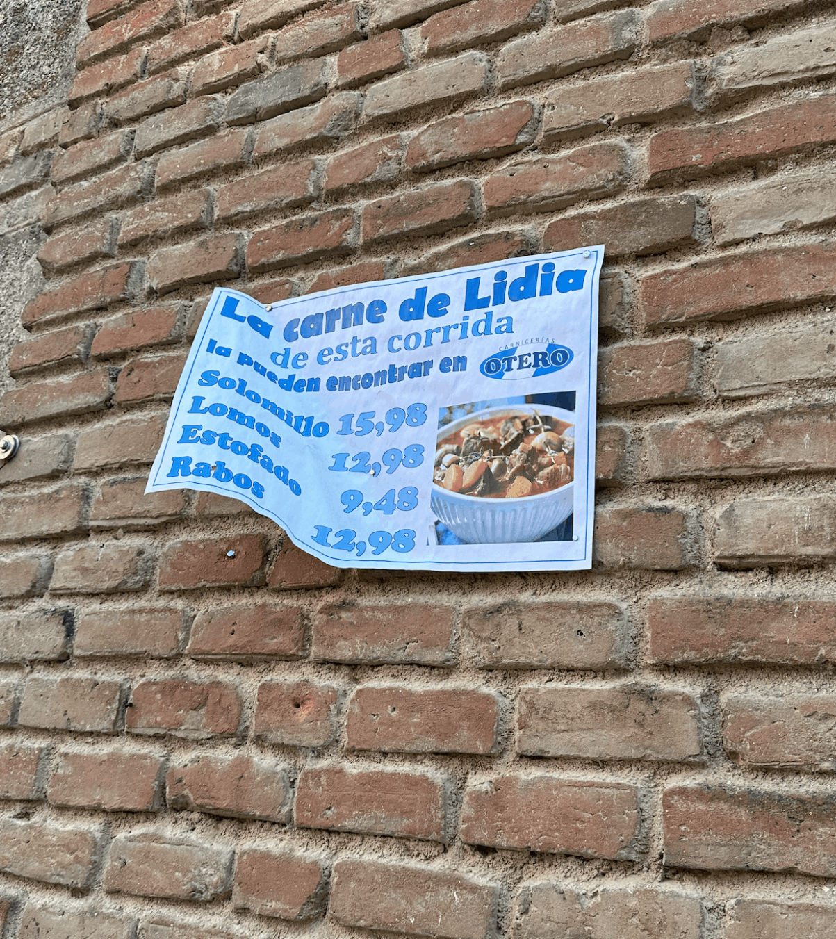 Acudir a Talavera es, por tanto, un acto sacro, una reivindicación justa de la memoria histórica, el recuerdo de un héroe, de una leyenda. Si los detalles no se cuidan en plazas como estas, apaga y vámonos. En las inmediaciones de la plaza unos carteles a color recordaban que la carne de lidia del festejo se vendía en una carnicería de la ciudad. Con indicación de los precios. Fue lo único que sacamos en claro del festejo: los carniceros se llevarán una buena ganancia una vez destajado este manjar que es la carne de toro de lidia y los clientes se meterán un buen solomillo de toro o prepararán un exquisito rabo de toro al estilo toledano o cordobés, como se prefiera. La mayor gloria de estos toros de Alcurrucén se jugará en una olla, en una plancha o en un plato. Fíjate.