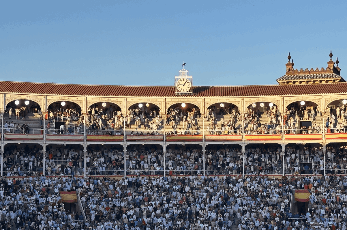 Todo mal. Antes de sonar clarines y timbales, en una megafonía ochentera, un locutor tartamudeante anuncia que se va a guardar un minuto de silencio y sonará el himno de España. Nada nuevo. Y pensé: verás lo poco que va a durar el minuto y lo poco que va a escucharse el silencio. Así fue. Unos cuantos borrachos dijeron no sé qué y se montó una turbamulta en los altos del siete, el mismo lugar de la famosa pancarta del primer día. El mal gusto ha colonizado el siete. ¿Será intencionado? La policía, en el día de su homenaje, compareció a echar a los borrachos cayetanos.