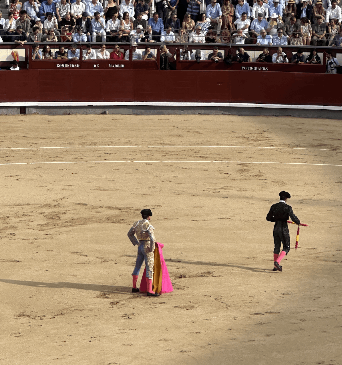 De la corrida en sí no esperábamos mucho. Sabemos que el público de Morante no acudió a la cita y que el público de Roca va a disfrutar de forma placentera con su torero. Es tal el espejismo que salió Manzanares a recibir a su toro y el público lo confundió con Roca. Así estaban las cosas. La corrida empezó con casi veinte minutos de retraso. Una buena parte del público se había demorado en los postres, la sobremesa y los gintonics y acudieron con el tiempo justo a la plaza. Total, el primero que toreaba era Morante. Pero no, no se pueden romper los cánones ni las normas: la corrida de toros es un acto litúrgico que empieza a la hora exacta en los carteles. El presidente, por otra parte, parecía igualmente despistado. Cuando Morante cogió su montera decimonónica por la mitad para pedir permiso al usía, este andaba hablando de la comida, o de la presencia de una tal Carmen Lomana o del juez Pedraz del caso Telegram. Morante aguantó estoico dos minutos para que el presidente devolviera el saludo.